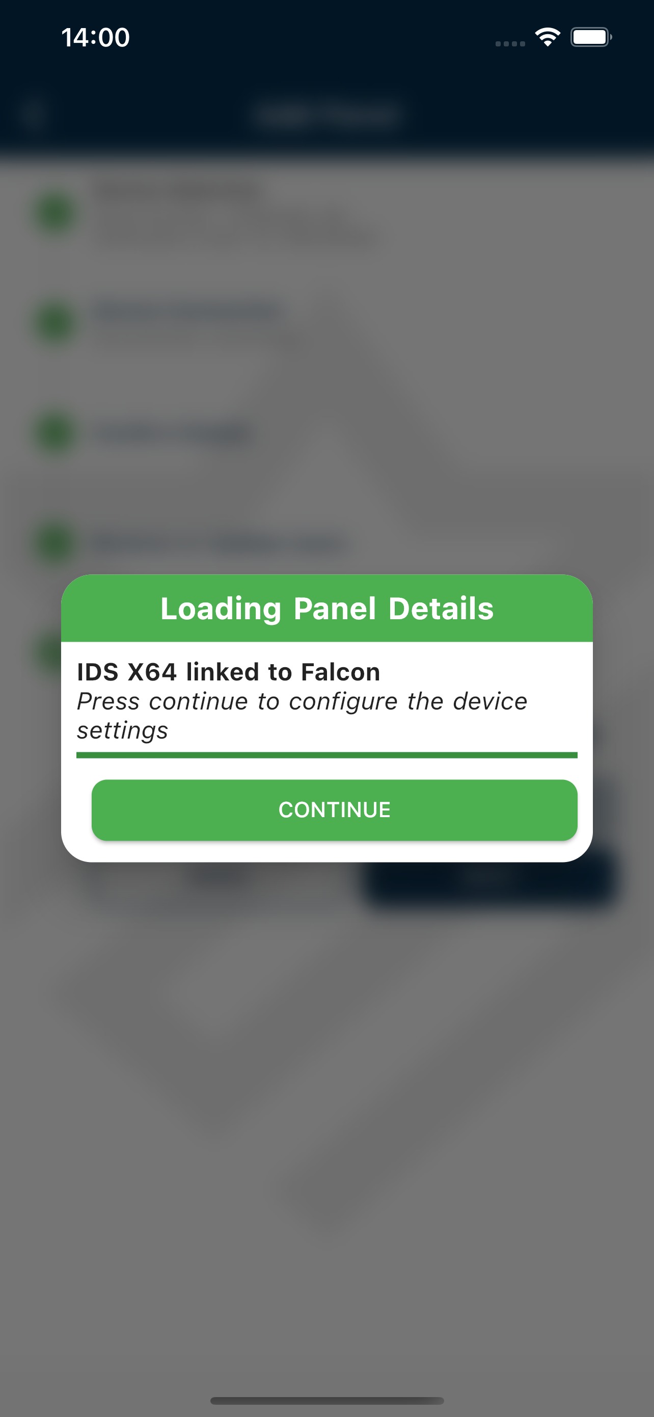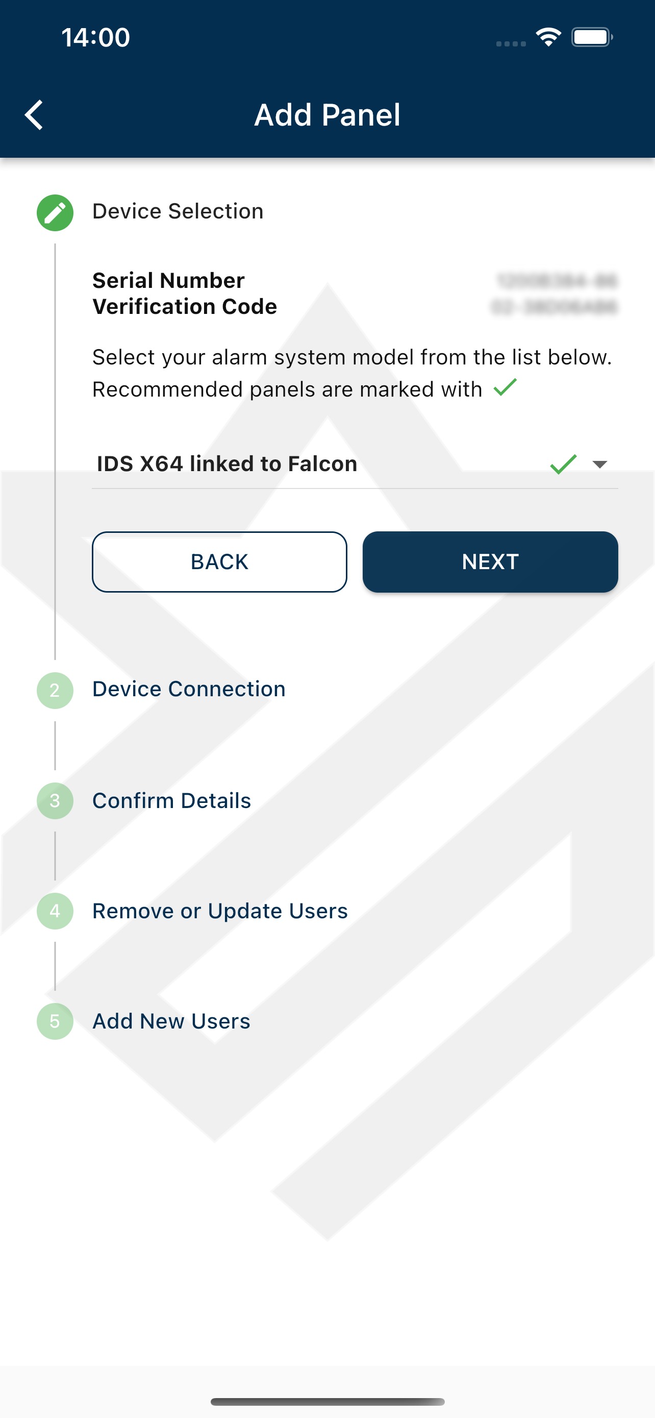 While on the home screen tap "INSTALL NEW" to be taken to the QR scanner screen. Either scan the qr code on the Falcon communicator or Rhino alarm system, or enter the serial number and verification code manually.