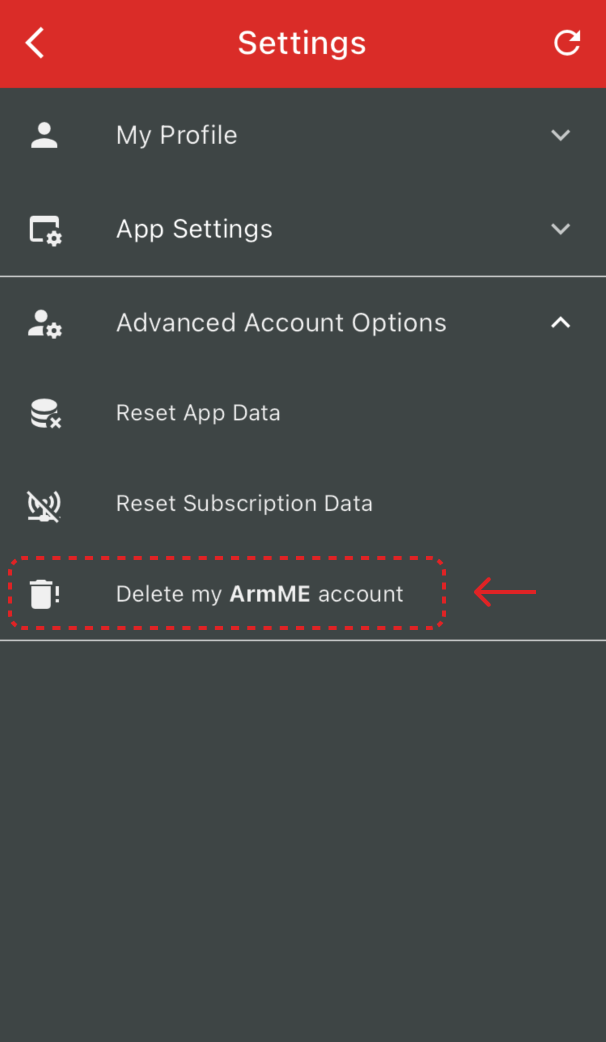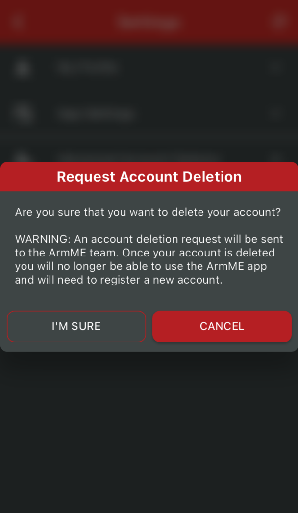 NOTE: Once your account is deleted you will no longer be able to use the ArmME app and will need to register a new account.