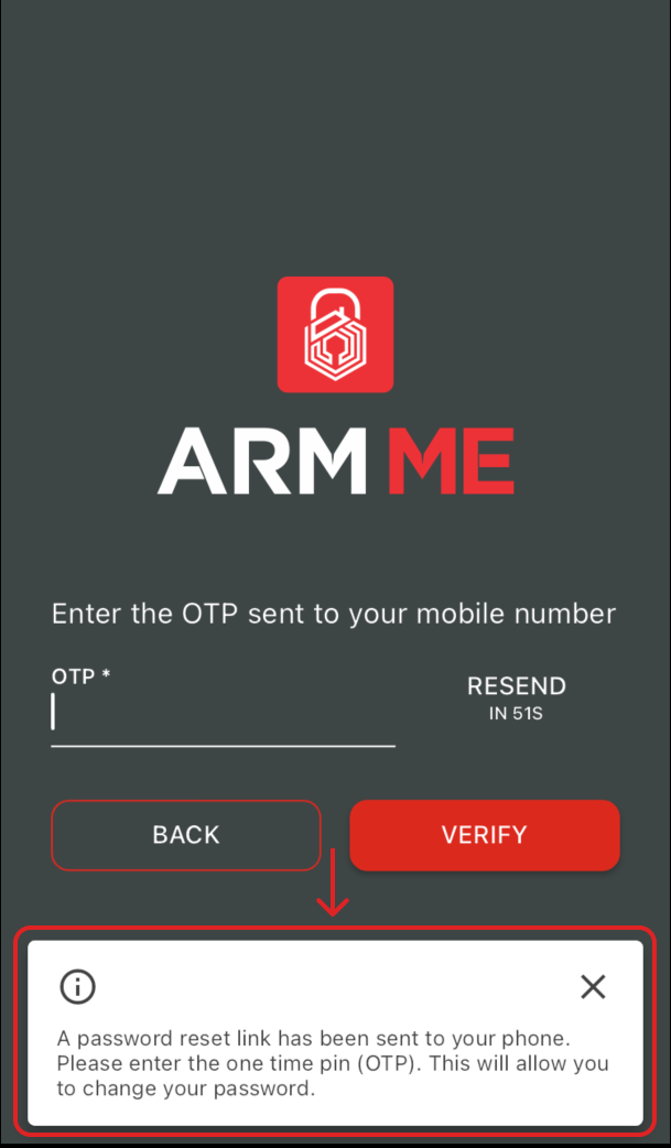 5. "A password reset link has been sent to your phone. Please enter the one-time PIN (OTP) to allow you to change your password."