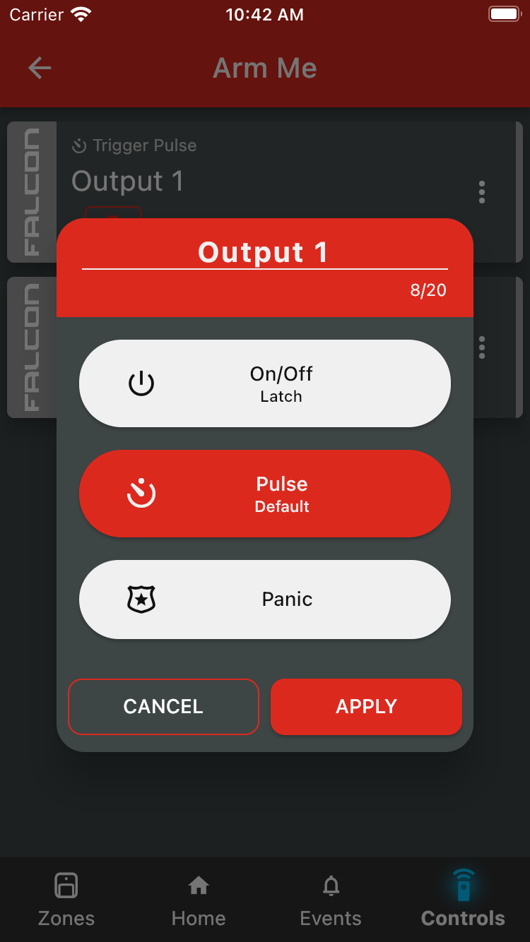 To change a control's name or output type from the security app, start by tapping the three dots on the right of the card to open the Output Settings dialogue. From here, you can change the name or select a new output type. Tap Apply to save your changes. To configure an output to be a Panic Button, please click here to learn more.