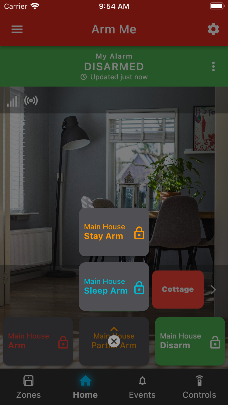 To Arm or Disarm your panel, press the corresponding button at the bottom of the screen. The red button arms your partition and the green button disarms the current area. The button will be highlighted based on the current state of the area.
